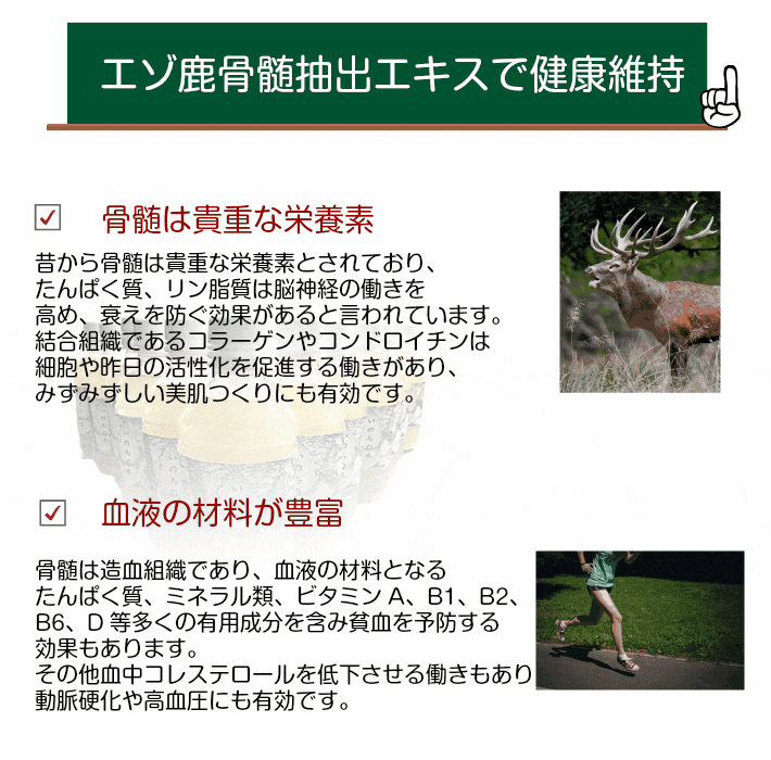 野生エゾ鹿肉はは脂分が少なくあっさりしたお肉なのが特徴です。鹿肉はとても低カロリーなので肥満気味の子やダイエット犬にも最適!いのちの水はコラーゲンやミネラルなど栄養源が豊富。いつものご飯に混ぜるもよし、そのまま飲み水として与えるもよし、鹿の骨の骨髄を最大限に抽出した成分が豊富です。