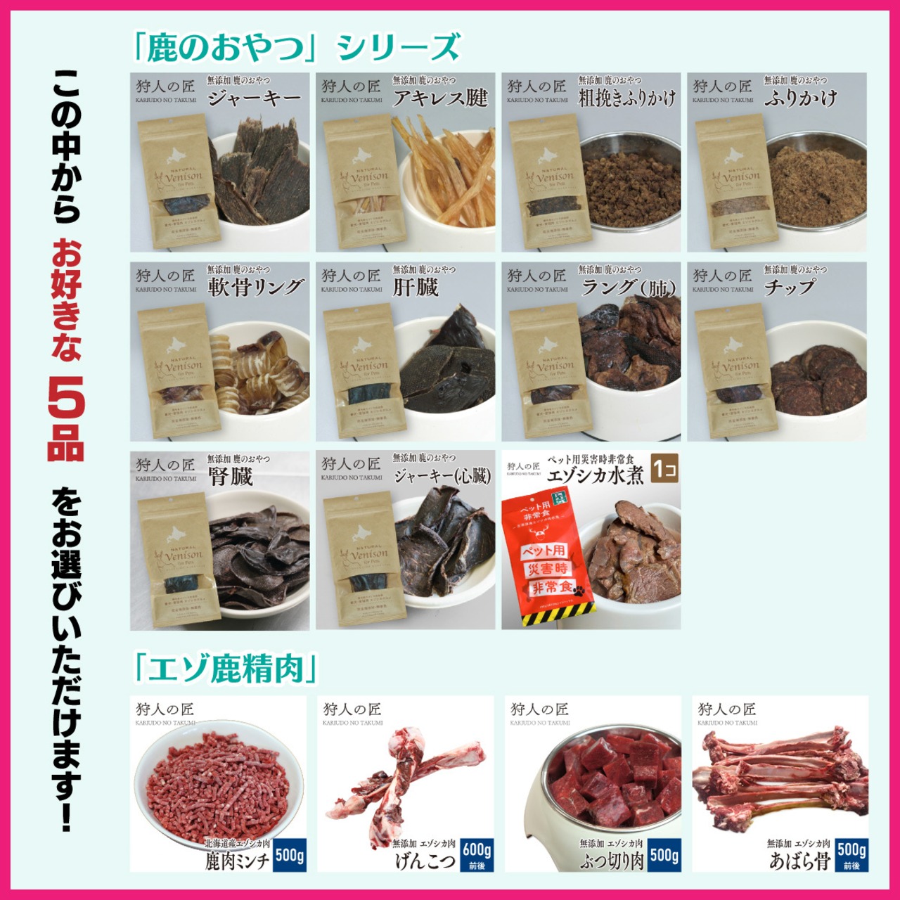無添加・無着色、鹿肉ペットフードの大人気のおやつシリーズがよりどり5点選べるお得なセットに!